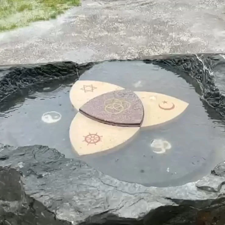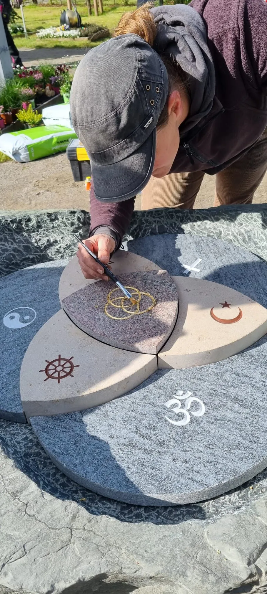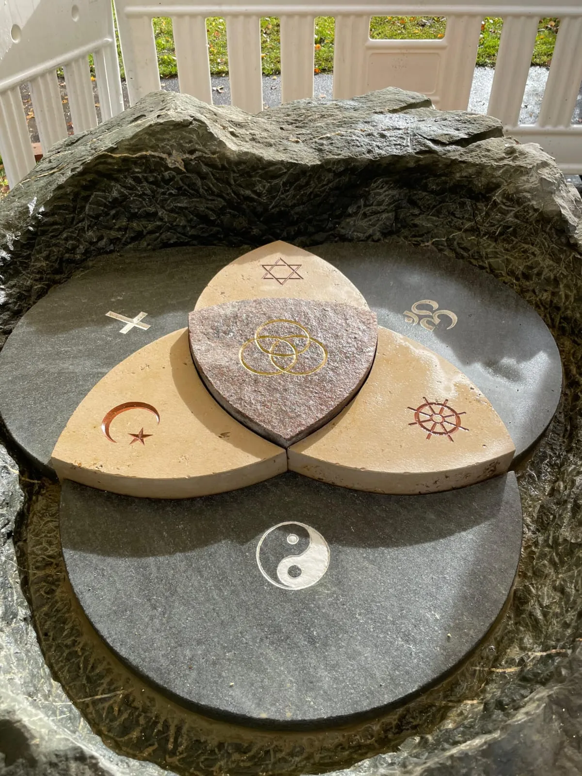 Das Kreuz steht für das Christentum, der Halbmond für den Islam, der Stern für den jüdischen Glauben, das Om-Zeichen ist das Symbol des Hinduismus, das Steuerrad steht für den Buddhismus und Yin Yang für den Taoismus- alle eingebetet in die "Ringparabel von Gotthold Ephraim Lessing